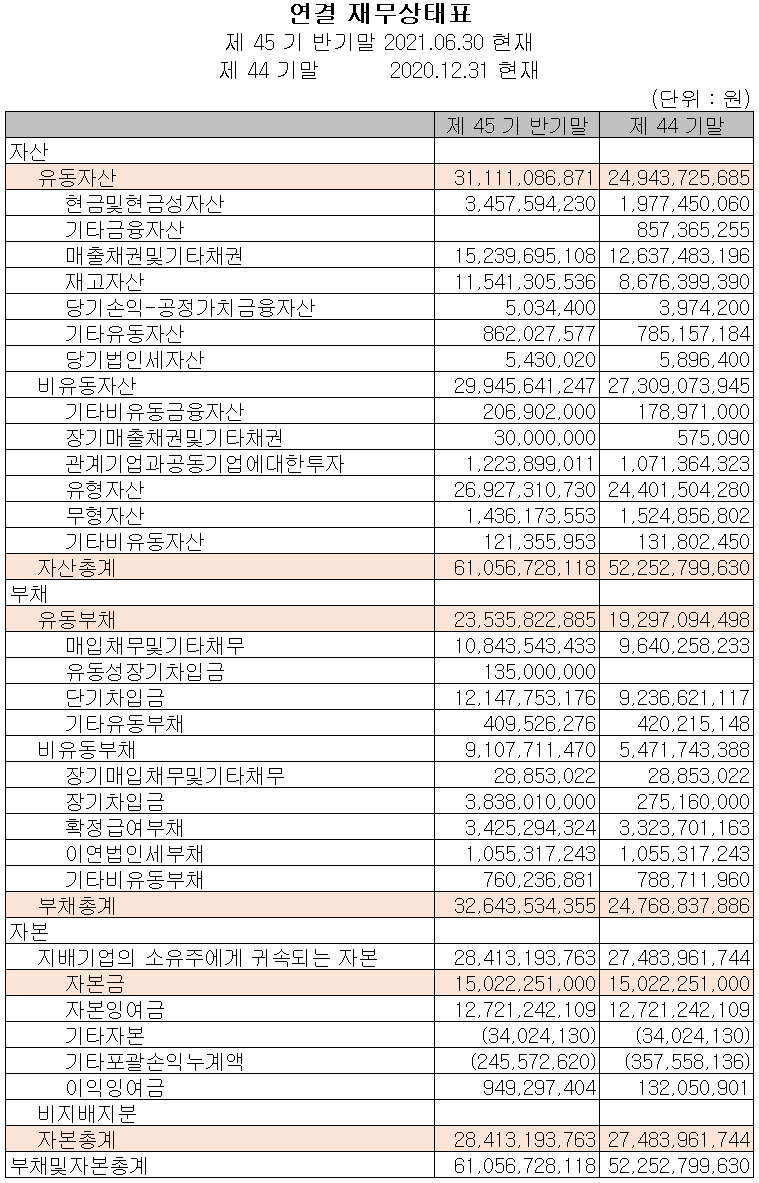 지난 상반기 말 현재 자산총계는 전기 말보다 16.8% 늘어난 611억 원으로 매출채권, 재고자산 및 유형자산의 증가에 기인합니다. 부채총계는 31.8%가 늘어나면서 326억 원으로 단기차입금 및 장기차입금의 증가에 따릅니다.