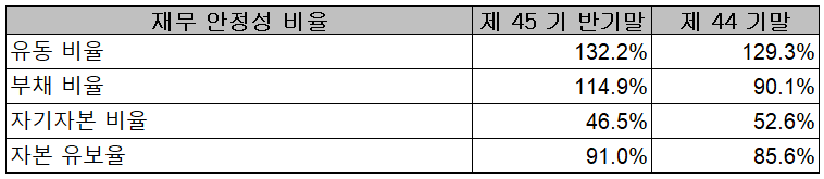2021년 상반기 말 기준 재무 안정성 비율에서는 유동비율 132.2%, 부채비율 114.9%, 자기자본비율 46.5%, 자본 유보율 91%를 기록했습니다.