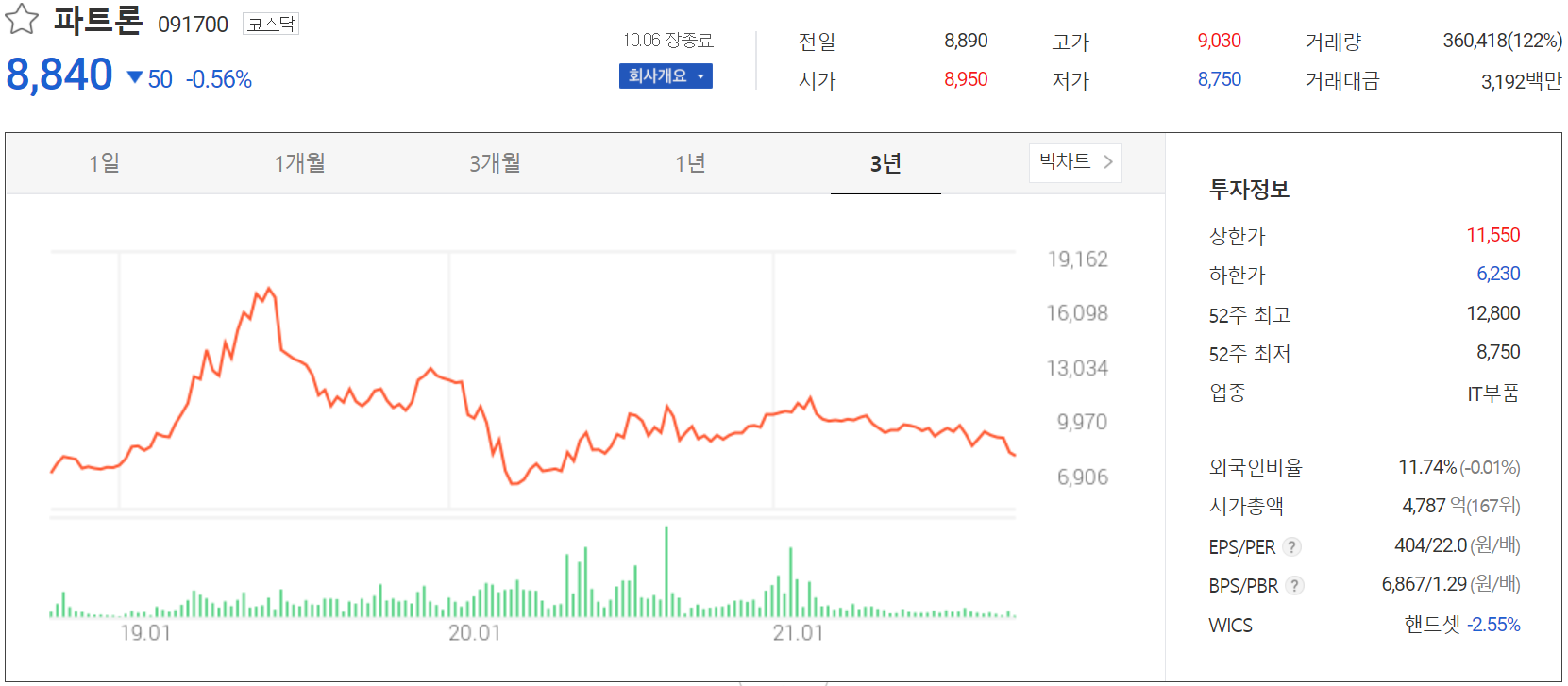 2021년 10월 6일 장 종료 기준 당사의 주가는 전일보다 0.56% 내린 8,840원에 거래를 마쳤습니다. 외국인 비율은 11.74%이며, 시가총액은 4,787억 원으로 코스닥 시총 기준 167위 종목입니다.