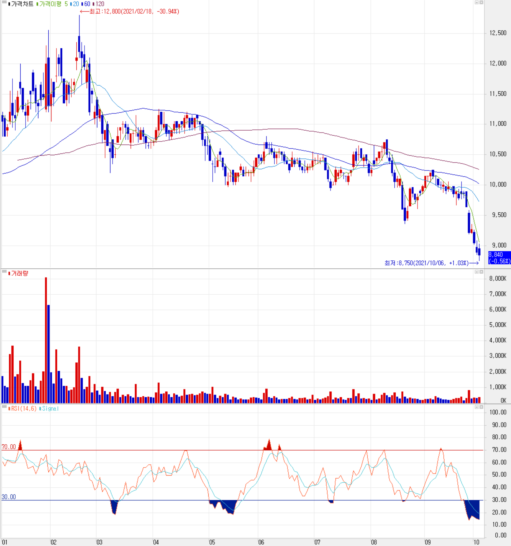 2021년 들어서면서 당사의 주가는 2월 연중 최고가인 12,800원을 기록한 후 차량용 반도체 수급 부족, 스마트폰 향 실적 부진, 미국발 인플레이션 및 중국 헝다 이슈 등 시장 외적인 상황 등이 잇달아 나오면서 계단식 하락을 하는 모습입니다. 수급에서는 달러 강세, 채권금리 상승 영향도 받으면서 외국인은 17 거래일 연속 순매도하고 있으며 대부분의 물량을 개인이 소화하고 있습니다. 개인적인 목표주가에서는 중장기적 관점에서 13,000원은 변화가 없으나, 최근 시장 상황을 고려할 때 신규 진입은 보류하고 관망할 예정입니다.