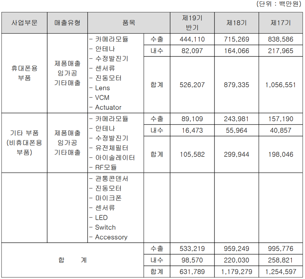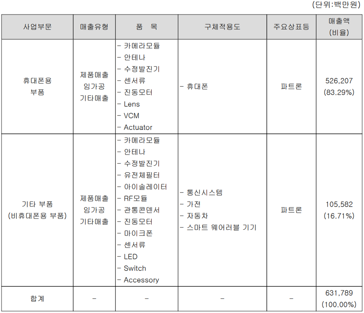 당사는 주로 카메라 모듈, 안테나, RF 모듈 등을 제조 공급하며 주로 휴대폰용 부품사업과 자동차 전장, 가전제품 및 웨어러블 기기 등에 적용되는 비휴대폰용 부품 사업부문으로 구성되어 있습니다. 지난 상반기 휴대폰용 부품 사업의 매출은 5,262억 원으로 전체 매출의 83.29%를 차지하였으며, 비휴대폰용 부품에서는 1,056억 원의 매출로 16.71%의 매출 비중을 기록했습니다.