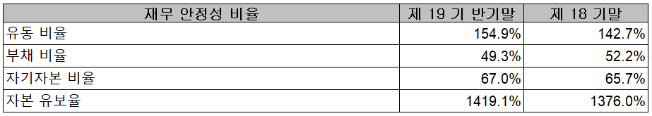 2021년 상반기 말 기준 재무안정성 비율에서는 유동비율 154.9%, 부채비율 49.3%, 자기자본비율 139.9%, 자본 유보율 1,419.1%를 기록하면서 전반적으로 양호한 재무상태를 유지하고 있습니다.