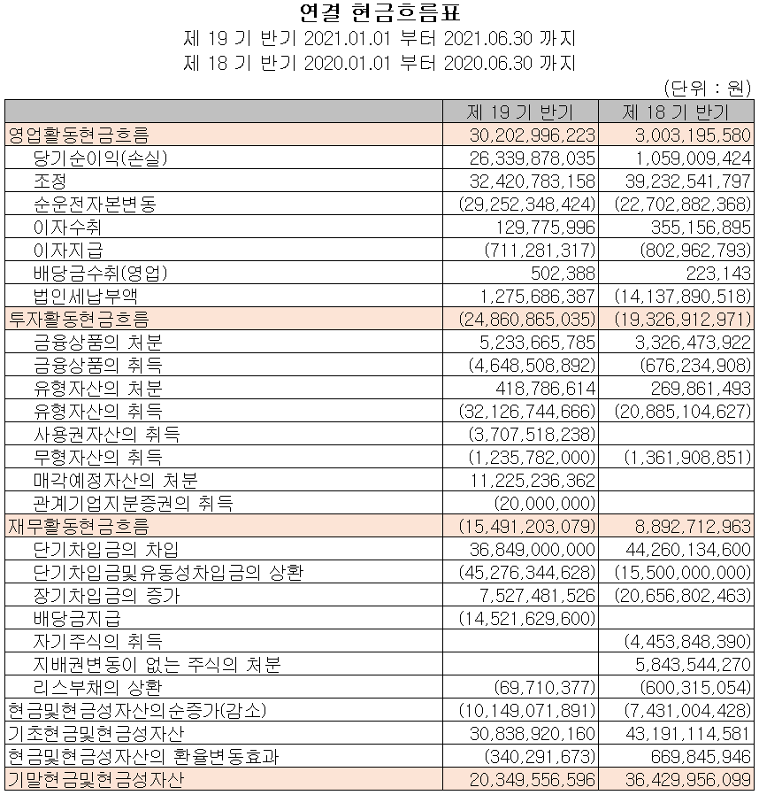 지난 상반기 영업활동 현금흐름에서는 302억 원의 현금이 유입되었으며, 투자활동에서는 유형자산, 사용권자산(부동산 및 토지 등) 및 금융자산의 취득으로 249억 원의 현금이 유출되었습니다. 재무활동에서는 차입금을 조달하여 당기 부채를 상환하고 배당금을 지급하였습니다. 2021년 상반기 말 기준 현금 및 현금성 자산은 161억 원이 줄어든 203억 원을 보유하고 있습니다.