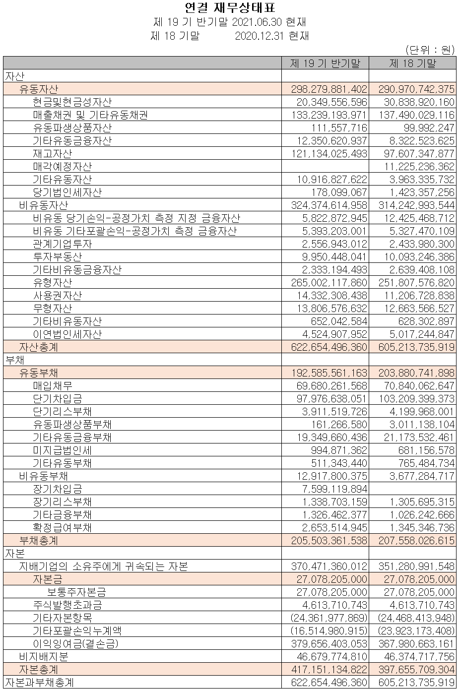 지난 상반기 말 현재 자산총계는 전기 말보다 2.9% 증가한 6,227억 원이며, 부채총계는 2% 줄어든 2,055억 원을 기록했습니다.