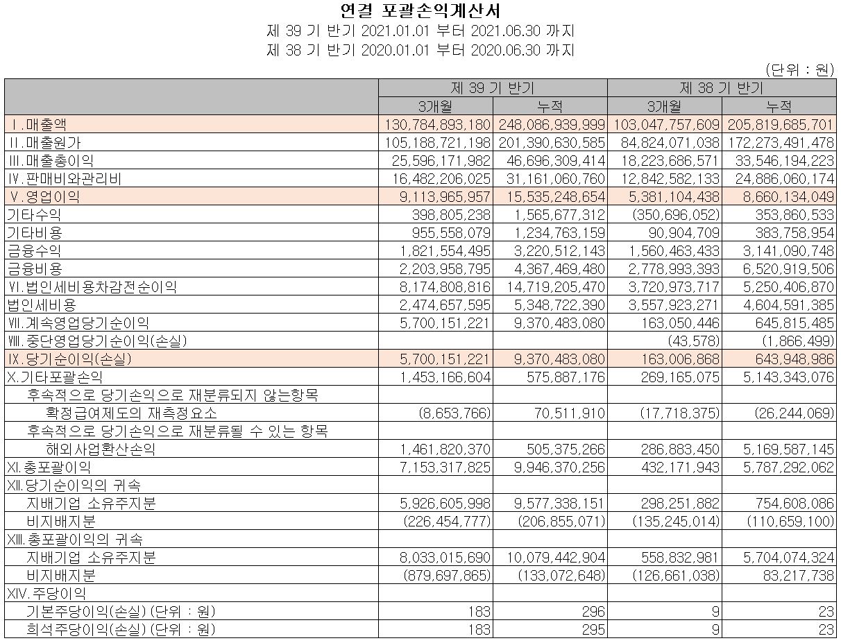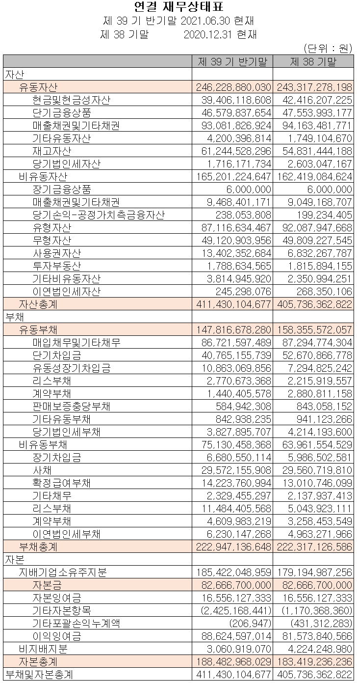 지난 상반기 말 현재 자산총계는 전기 말보다 57억 원이 늘어난 4,114억 원으로 재고자산 및 유형자산의 증가에 기인합니다. 부채총계는 0.3% 늘어난 2,229억 원을 기록했습니다. 당기 이익잉여금의 증가로 자본총계는 51억 원이 늘어난 1,885억 원을 기록했습니다.