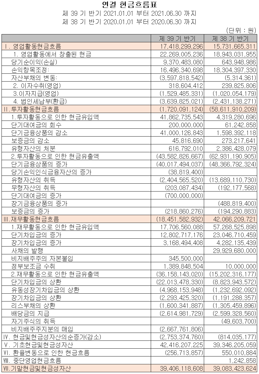 지난 상반기 영업활동 현금흐름에서는 당기순이익 및 손익 항목의 조정으로 총 174억 원의 현금이 유입되었으며, 투자활동에서는 단기 금융상품의 증가와 유형자산의 취득으로 17억 원의 현금이 유출되었습니다. 재무활동에서는 장단기 차입금을 차입하여 자금을 조달하였고, 당기 부채를 상환하고 배당금을 지급하였습니다.