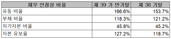 2021년 상반기 재무안정성 비율에서는 유동비율 166.6%, 부채비율 118.3%, 자기자본비율 45.8%, 자본 유보율 127.2%를 기록하면서 부채비율이 높은 편이지만 자동차 부품 산업에서는 무난한 편이며, 고객사의 고급차 판매 및 전기차 수요 급증에 따라 당사의 제품 단가 및 수익성 개선 등으로 향후 재무제표의 개선도 예상하고 있습니다.