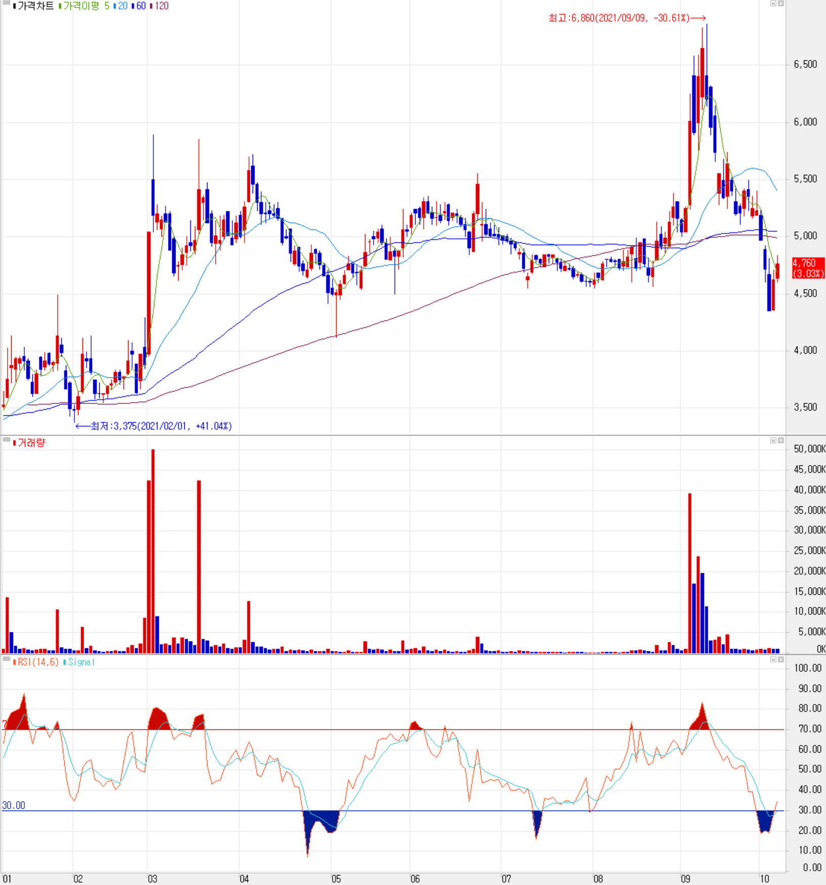 10월 9일 장 종료 기준 당사의 주가는 전거래일보다 3.03% 오른 4,760원에 거래를 마쳤습니다. 외국인 비율은 1.6%이며 시가총액 1,574억 원으로 코스피 시총 기준 683위 종목입니다.