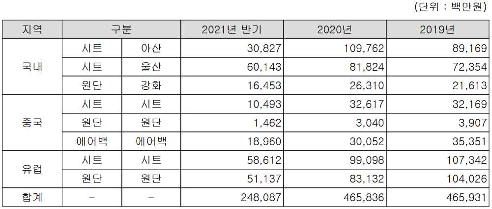 당사는 패브릭(원단), 카시트, 에어백 등 자동차 부품을 제조, 공급하는 단일 사업부문으로 원단 사업부문의 매출은 690억 원으로 전체 매출의 27.8%를 차지하였으며, 카시트의 매출은 1,601억 원으로 64.5%, 에어백은 190억 원의 매출로 7.6%의 매출 비중을 나타냈습니다.