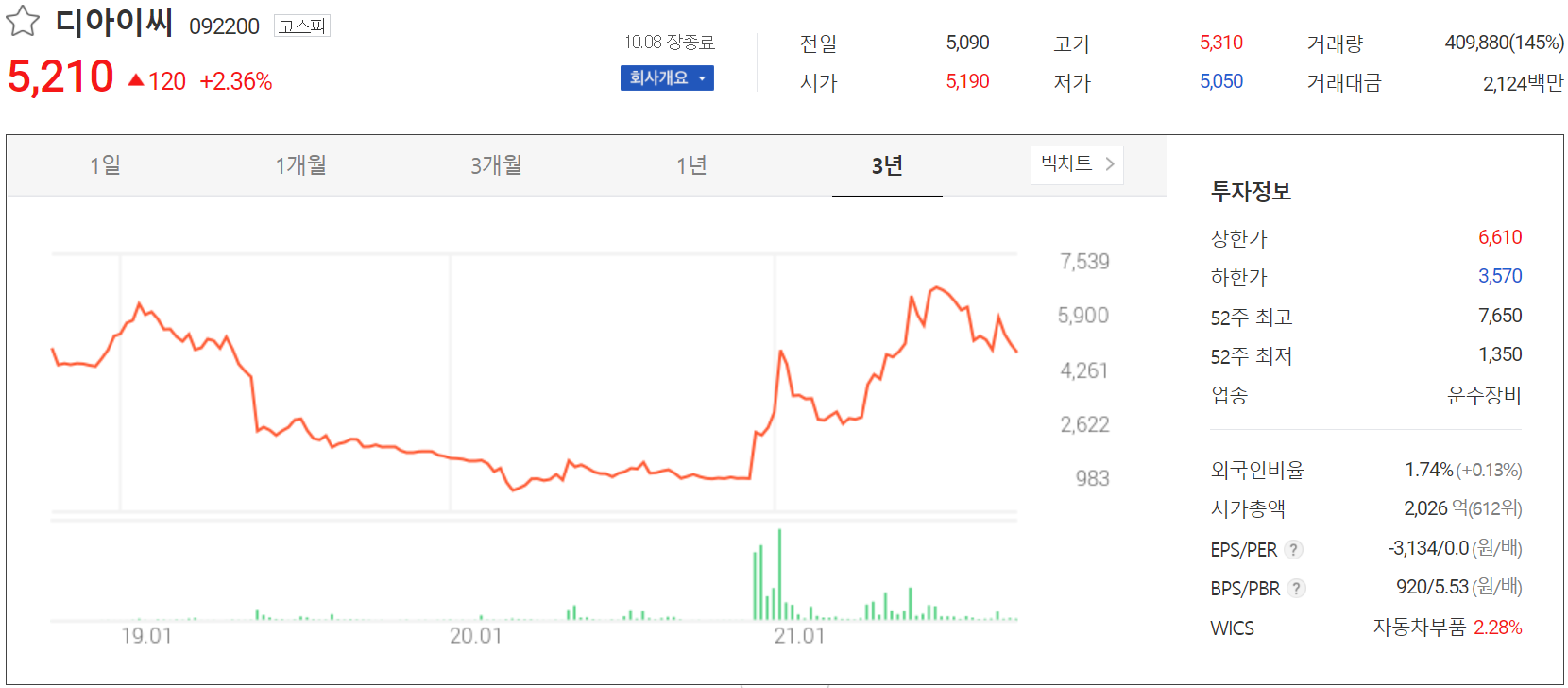 10월 8일 장 종료 기준 당사의 주가는 전 거래일보다 2.36% 오른 5,210원에 거래를 마감했습니다. 외국인 비율은 1.74%이며, 시가 총액은 2,026억 원으로 코스피 시총 기준 612위 종목입니다.
