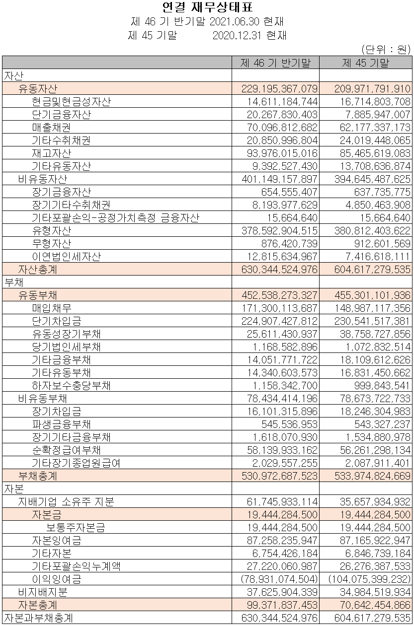 지난 상반기 말 현재 자산총계는 전기 말보다 4.3% 증가한 6,303억 원으로 단기금융자산 및 수취채권의 증가에 기인합니다. 부채총계는 0.6% 감소한 5,310억 원을 기록했습니다.