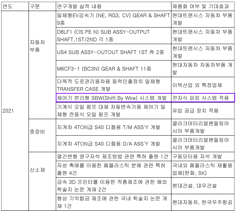 당사는 지난 상반기 매출액의 0.54%인 16억 원 규모의 비용을 투입하면서 고객사 신규 자동차 변속기 등 부품 개발과 국내 최초로 제어기 분리형 전자식 변속 레버(SBW, Shift By Wire) 국산화에 성공하는 등 연구개발을 지속적으로 수행하고 있습니다.