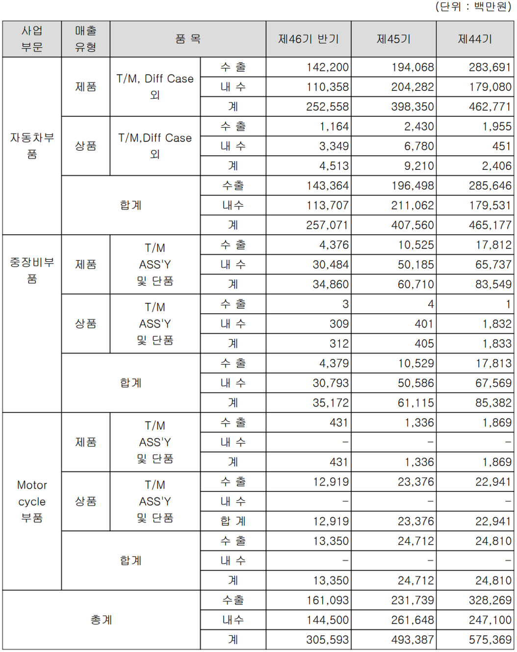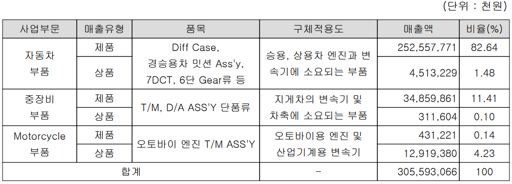 당사는 동력 전달 장치의 제조 기술 기반으로 Diff case, 미션, 변속기 및 전기차 감속기 등을 제조하는 자동차 부품, 지게차 변속기 및 차축용 부품 등 중장비 부품 그리고 오토바이용 엔진과 산업기계용 변속기 등을 생산하는 모터사이클 부품 사업 등으로 구성되어 있습니다. 2021년 상반기 자동차 부품 부문의 매출액은 2,571억 원으로 84.12%를 차지하였으며, 중장비 부품 사업에서는 매출액 352억 원으로 11.51%를 기록했으며 모터사이클 부문에서는 134 억 원으로 4.37%의 매출 비중을 나타냈습니다.