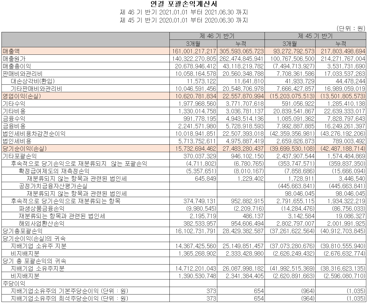 지난 상반기 영업활동 현금흐름에서는 415억 원의 현금이 유입되었으며, 투자활동에서는 금융자산 및 유형자산의 취득으로 220억 원의 현금이 유출되었습니다. 재무활동에서는 장기차입금을 차입하여 자금을 조달하고 당기부채를 상환하였습니다. 2021년 상반기 말 기준 현금 및 현금성 자산은 전년 동기 말보다 116억 원이 감소한 146억 원을 확보하고 있습니다.