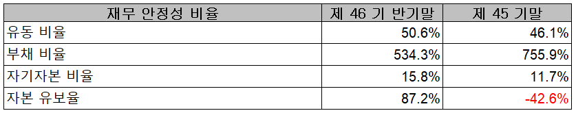 2021년 상반기 말 기준 재무안정성 비율에서는 유동비율 50.6%, 부채비율 534.3%, 자기자본비율 15.8%, 자본 유보율 87.2%를 기록했습니다. 자동차 부품사로 내연기관 차량에서 친환경차량으로의 전환에 따른 변화와 코로나19로 인해 영업손실 등으로 인한 부채비율이 증가하면서 어려움을 겪고 있는 상황입니다. 하지만 주 고객사 및 전기차 산업의 성장이 가시화되면서 당반기 225억 원의 영업이익을 달성하는 등 점차 개선된 재무제표를 보일 것으로 기대하고 있습니다.