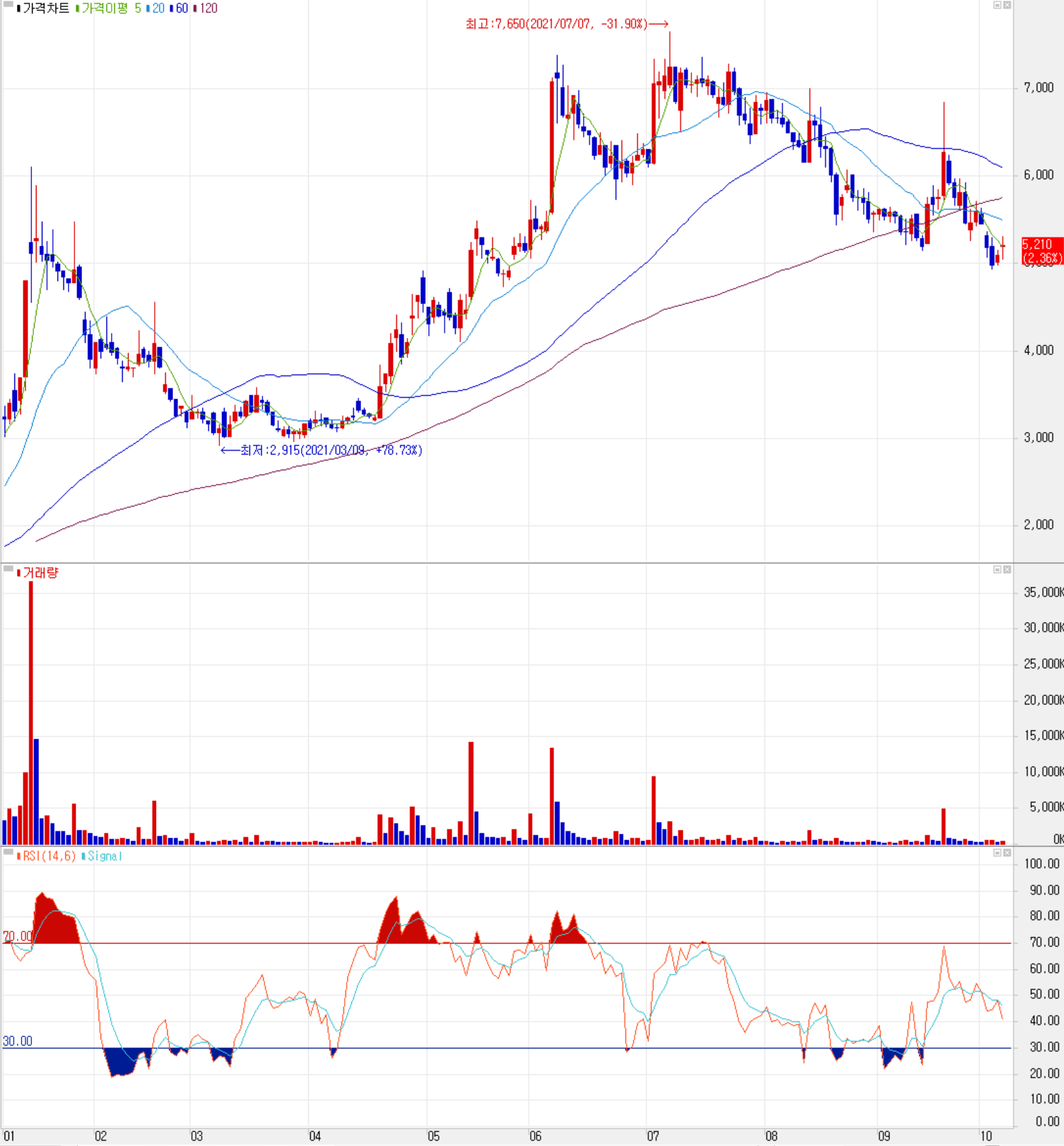 10월 8일 장 종료 기준 당사의 주가는 전 거래일보다 2.36% 오른 5,210원에 거래를 마감했습니다. 외국인 비율은 1.74%이며, 시가 총액은 2,026억 원으로 코스피 시총 기준 612위 종목입니다.