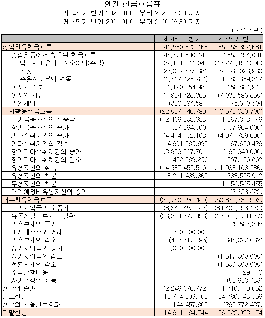 지난 상반기 영업활동 현금흐름에서는 415억 원의 현금이 유입되었으며, 투자활동에서는 금융자산 및 유형자산의 취득으로 220억 원의 현금이 유출되었습니다. 재무활동에서는 장기차입금을 차입하여 자금을 조달하고 당기부채를 상환하였습니다. 2021년 상반기 말 기준 현금 및 현금성 자산은 전년 동기 말보다 116억 원이 감소한 146억 원을 확보하고 있습니다.