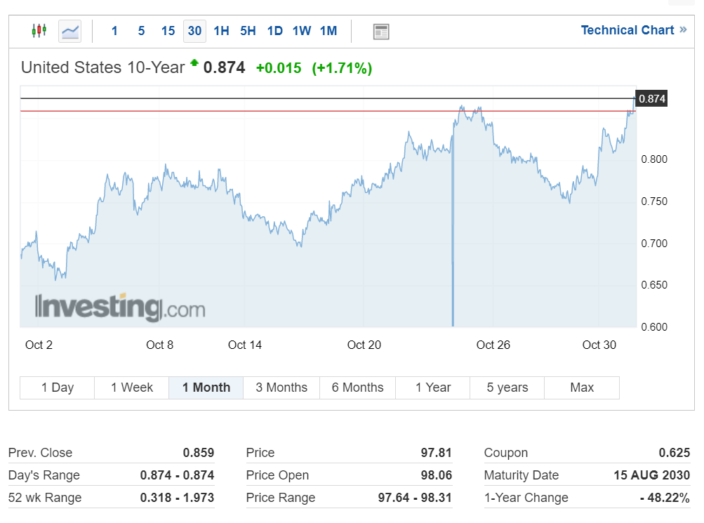 글로벌 시장 불안감에 따른 안전자산에 대한 선호심리로 미국 채권 10년 물은 현재 1.71% 오른 0.874%를 기록 중입니다.