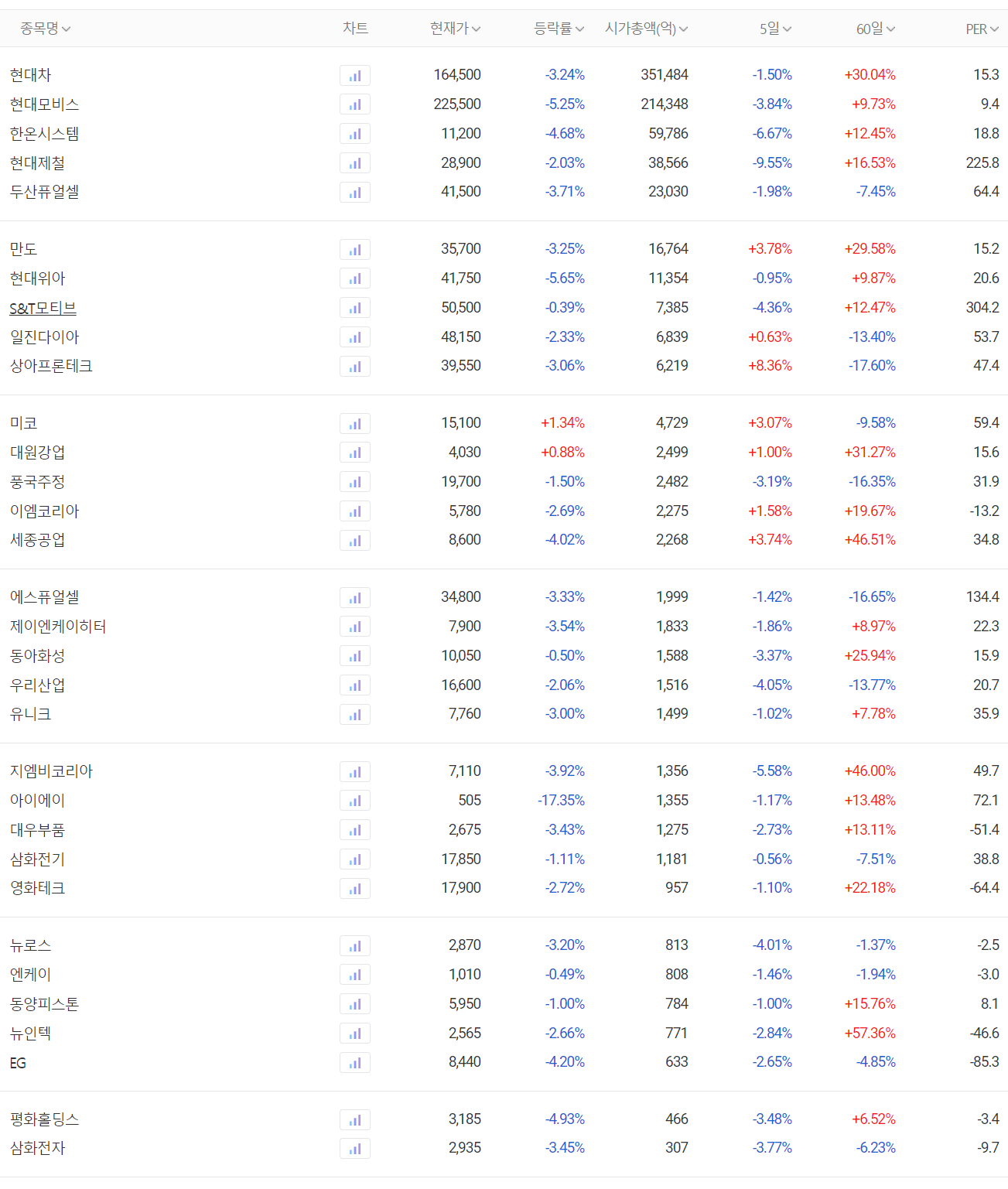 수소차(수소 연료 전지) 관련주 대장주 주간 시황