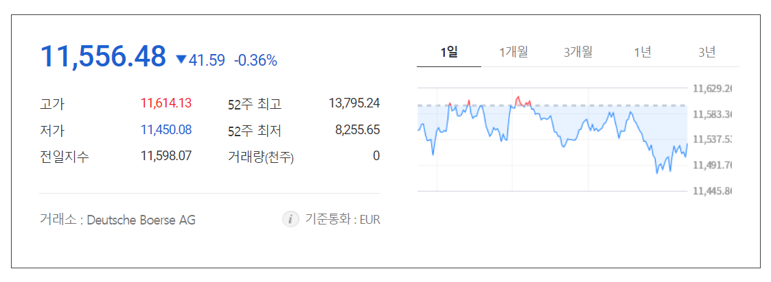 지난 한주간의 독일 DAX 지수는 1089.27포인트(8.61%) 내린 11556.48를 기록했습니다.