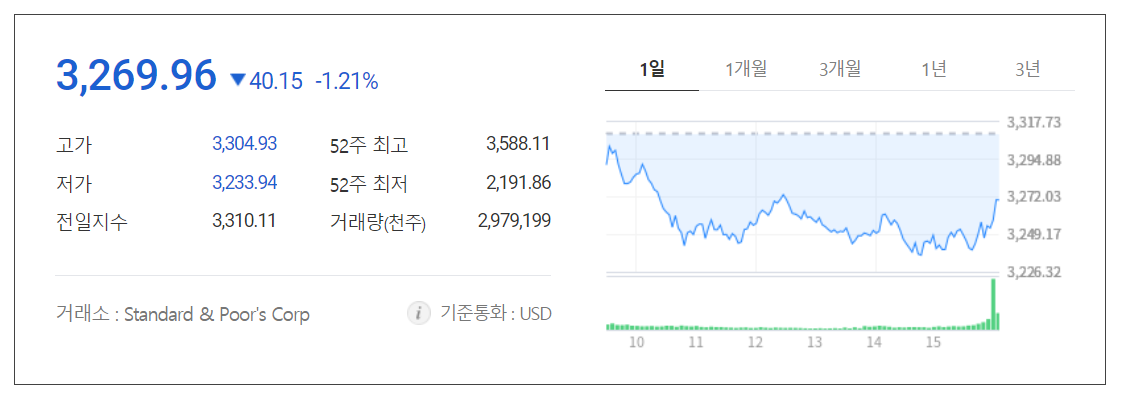 S&P500는 그 전주 마지막 거래일 종가 대비 195.43포인트(5.63%) 하락한 3269.96에 장을 마쳤습니다.
