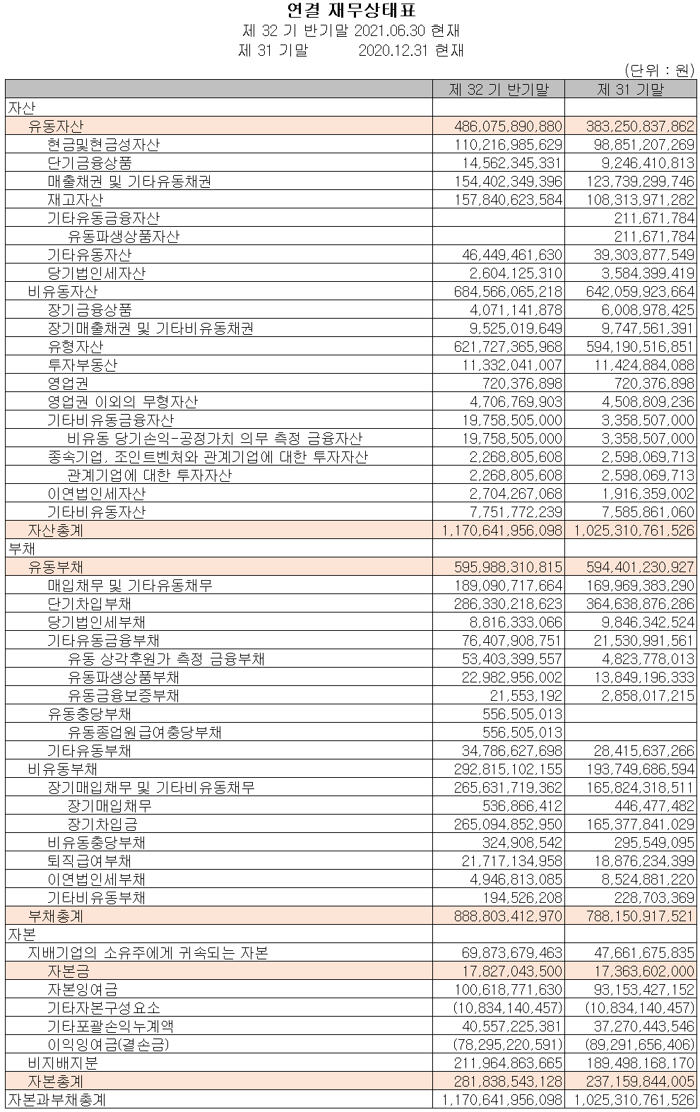 지난 상반기 말 기준 영업활동 현금흐름에서는 113억 원이 현금이 유입되면서 꾸준히 현금창출을 기록하고 있습니다. 투자활동 현금흐름에서는 유형자산 및 금융자산과 단기대여금의 취득 등으로 882억 원의 현금이 유출되었습니다. 재무활동에서는 차입금의 차입과 사채 및 전환사채를 통해 자금을 조달하여 당기 부채를 상환하고 배당금 및 이자를 지급하였습니다. 2021년 상반기 말 기준 현금 및 현금성 자산은 전년 동기 말보다 227억 원이 늘어난 1,102억 원을 기록했습니다.