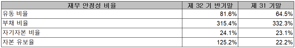 2021년 상반기 말 기준 재무안정성 비율에서는 유동비율 81.6%, 부채비율 315.4%, 자기 자본비율 24.1%, 자본 유보율 125.2%를 기록하였습니다. 자회사 명신의 관련 사업에 대한 연구 개발, 명신산업의 테슬라향 공급능력 확대를 위한 현지 설비 투자, 현대기아차향 중국 시장 확대 등으로 인한 투자 확대 등으로 부채비율이 높은 편입니다. 다만 독보적인 기술력으로 기존 내연기관 차량은 물론 친환경 자동차향 수요가 급증하고 있어 점차 투자에 따른 ROI가 가시화될 것으로 예상합니다. 한편 지난 2019년 자회사 명신을 통해서 인수한 군산공장(구 한국 GM 군산공장)은 중국 바이톤의 자금난 등 몇 가지 사유로 전기차 위탁생산 계획 등이 지연되어 실적이 미미한 상황입니다. 현재는 전기차 소형 밴을 위탁 생산하면서 소규모 매출을 시작하고 있습니다.