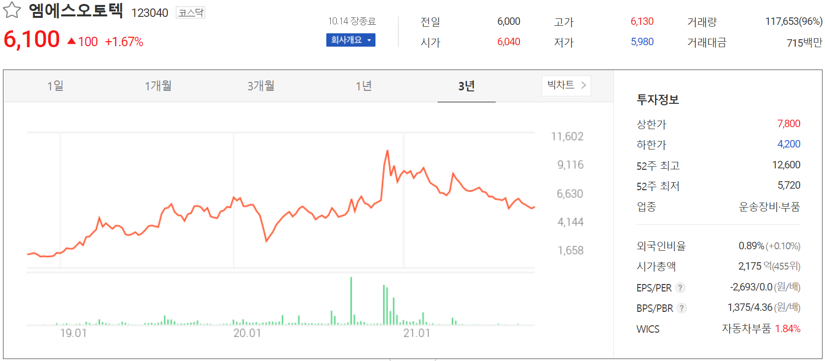 10월 14일 장 종료 기준 당사의 주가는 전일보다 1.67% 오른 6,100원에 거래를 마쳤습니다. 외국인 비율은 0.89%이며, 시가 총액 2,175억 원으로 코스닥 시총 기준 455위 종목입니다.