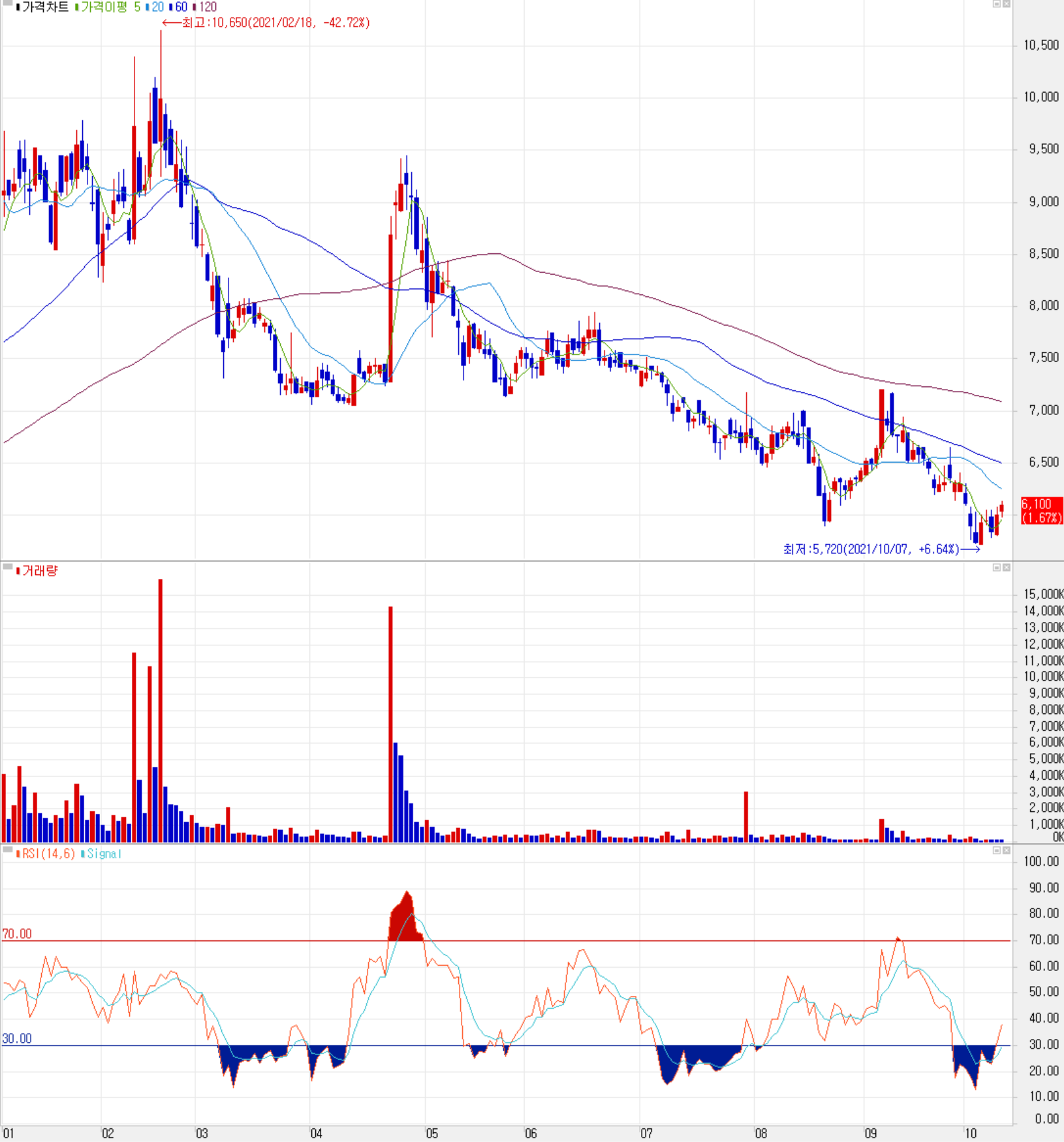 10월 14일 장 종료 기준 당사의 주가는 전일보다 1.67% 오른 6,100원에 거래를 마쳤습니다. 외국인 비율은 0.89%이며, 시가 총액 2,175억 원으로 코스닥 시총 기준 455위 종목입니다.