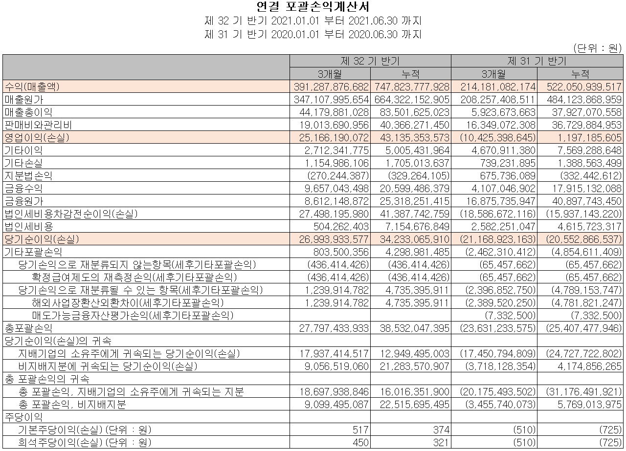 지난 2분기 당사의 실적은 매출액 3,913억 원으로 전년 동기 대비 82.7% 증가했고, 영업이익과 당기순이익은 각각 252억 , 270억 원으로 흑자 전환했습니다.