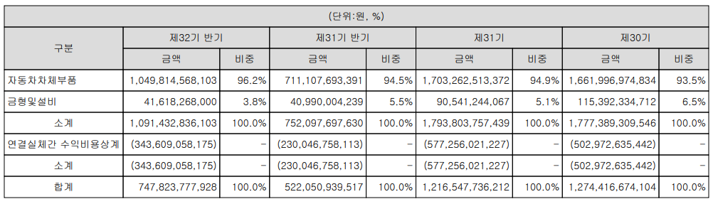 당사는 세계 최고 수준의 핫스탬핑 기술력과 양산 노하우를 보유하고 있는 명신산업과 자동차 차체 부품 경량화를 통한 전기차, 수소차 등 친환경 차량의 부품을 제조, 공급하고 있습니다. 지난 상반기 기준 당사의 자동차 차체부품 매출은 1조 498억 원으로 전체 매출의 96.2%를 차지하고 있습니다.