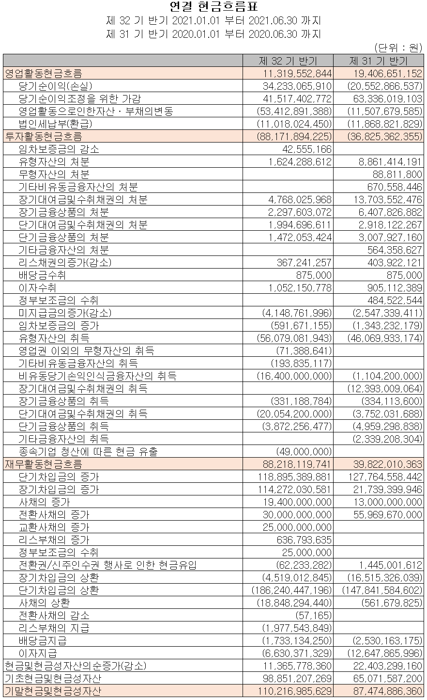 지난 상반기 말 기준 영업활동 현금흐름에서는 113억 원이 현금이 유입되면서 꾸준히 현금창출을 기록하고 있습니다. 투자활동 현금흐름에서는 유형자산 및 금융자산과 단기대여금의 취득 등으로 882억 원의 현금이 유출되었습니다. 재무활동에서는 차입금의 차입과 사채 및 전환사채를 통해 자금을 조달하여 당기 부채를 상환하고 배당금 및 이자를 지급하였습니다. 2021년 상반기 말 기준 현금 및 현금성 자산은 전년 동기 말보다 227억 원이 늘어난 1,102억 원을 기록했습니다.