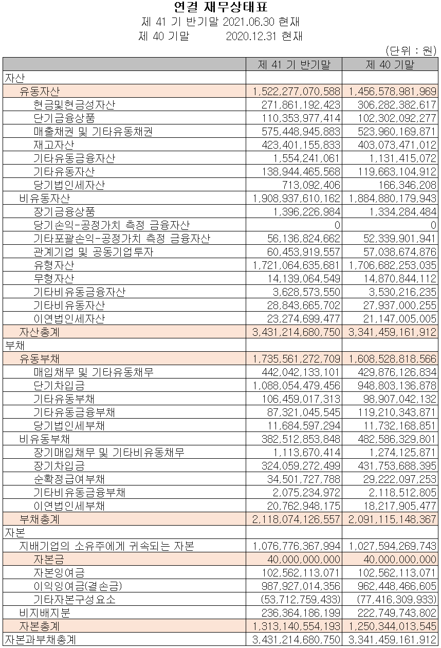 지난 상반기 영업활동 현금흐름에서는 총 706억 원의 현금이 유입되었으며, 투자활동에서는 금융상품의 증가와 유형자산의 취득 등으로 1,028억 원의 현금이 유출되었습니다. 재무활동에서는 차입금을 차입하여 당기 부채를 상환하고 이자 및 배당금을 지급하였습니다. 2021년 상반기 말 기준 현금 및 현금성 자산은 전년 동기 말보다 816억 원이 증가한 2,719억 원을 보유하고 있습니다.