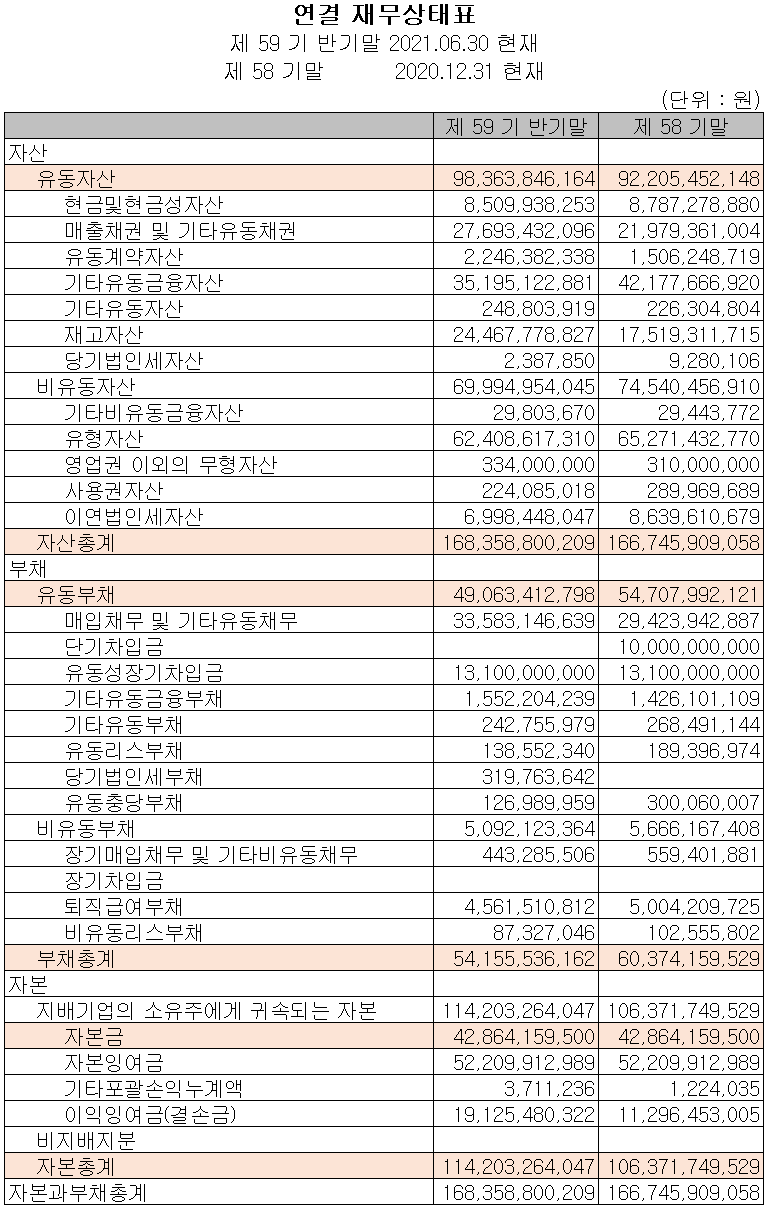 지난 상반기 말 현재 자산총계는 전기 말보다 1% 증가한 1,684억 원이며, 부채총계는 단기차입금의 감소로 10.3%가 줄어들면서 542억 원을 기록했습니다. 당기 잉여금의 증가에 따라 자본총계도 7.4% 늘어난 1,142억 원을 나타냈습니다.