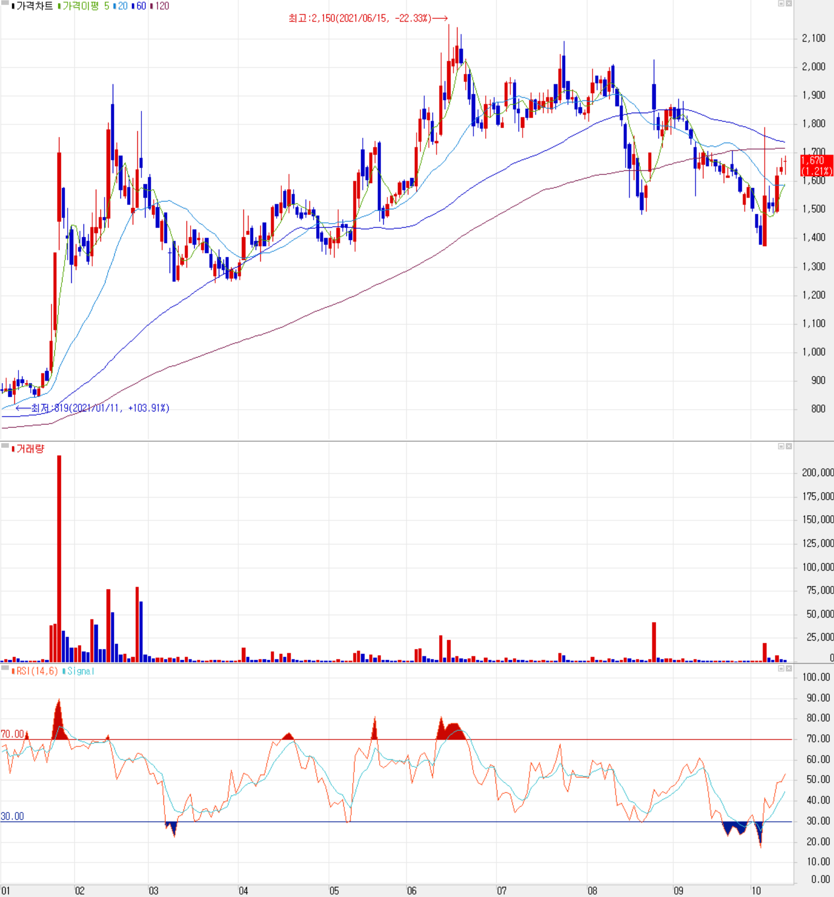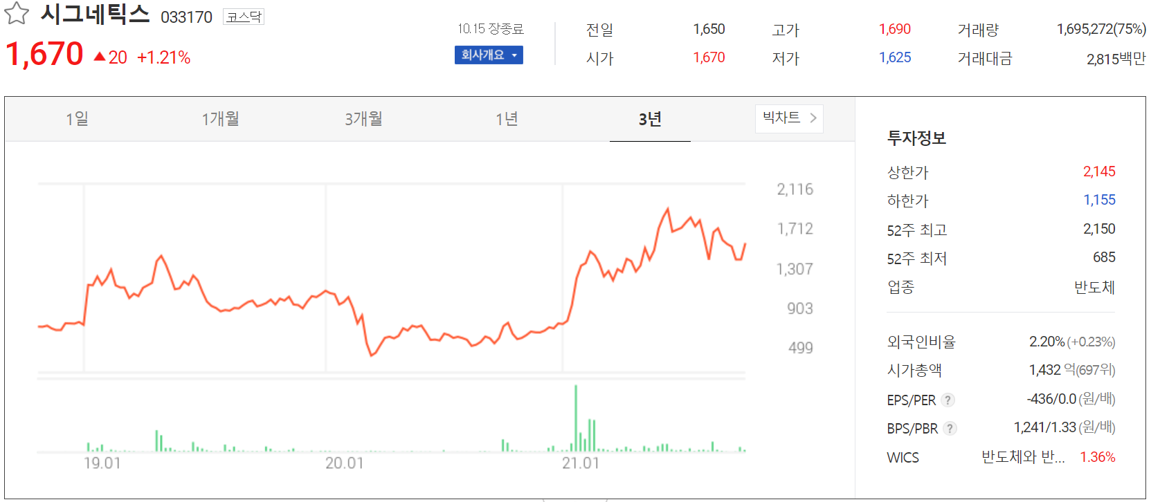 10월 15일 장 종료 기준 당사의 주가는 전일보다 1.21% 오른 1,670원에 거래를 마쳤습니다. 외국인 비율은 2.20%이며 시가 총액은 1,432억 원으로 코스닥 시총 기준 697위 종목입니다.