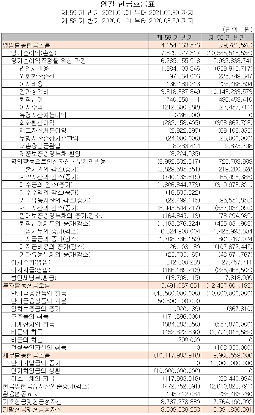 지난 상반기 영업활동 현금흐름에서는 반기 순이익으로 인해 42억 원의 현금이 유입되었으며, 투자활동에서는 금융상품 및 유형 자산의 취득으로 55억 원의 현금이 유출되었습니다. 재무활동에서는 당기 부채를 상환하였습니다. 2021년 상반기 말 기준 현금 및 현금성 자산은 전년 동기 말보다 31억 원이 증가한 85억 원을 보유하고 있습니다.