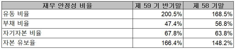 2021년 상반기 말 기준 재무안정성 비율에서는 유동 비율 200.5%, 부채 비율 47.4%, 자기자본 비율 67.8%, 자본 유보율 166.4%를 기록하면서 양호한 재무상태를 유지하고 있습니다.