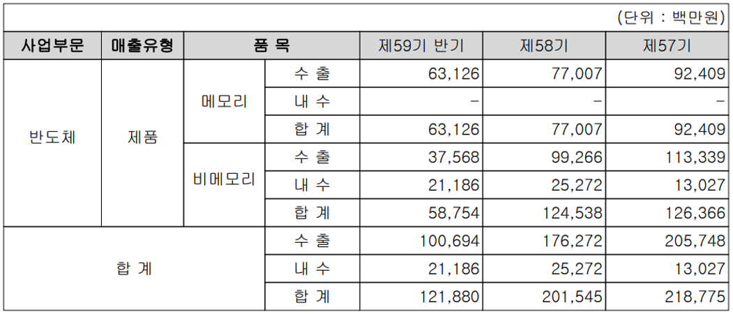 당사의 실적에서 메모리 부문은 전량 수출에 의존하고 있으며, 비메모리에서 수출은 376억 원, 내수는 212억 원으로 각각 63.9%, 36.1%의 비중을 기록했습니다. 당사 상반기 매출 전체에서 수출은 1,007억 원으로 82.6%, 내수는 212억 원으로 17.4%의 매출 비중을 나타냈습니다.