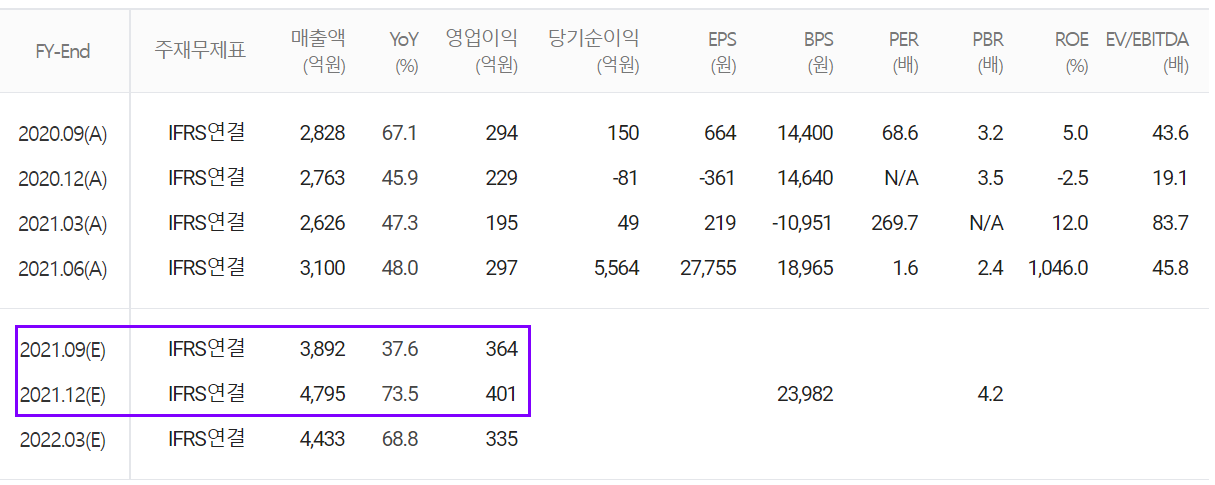 당사의 3분기 및 4분기 예상 실적은 각각 매출액 3,892억 원으로 37.6%, 4,795억 원으로 73.5% 증가할 것으로 내다봤습니다.