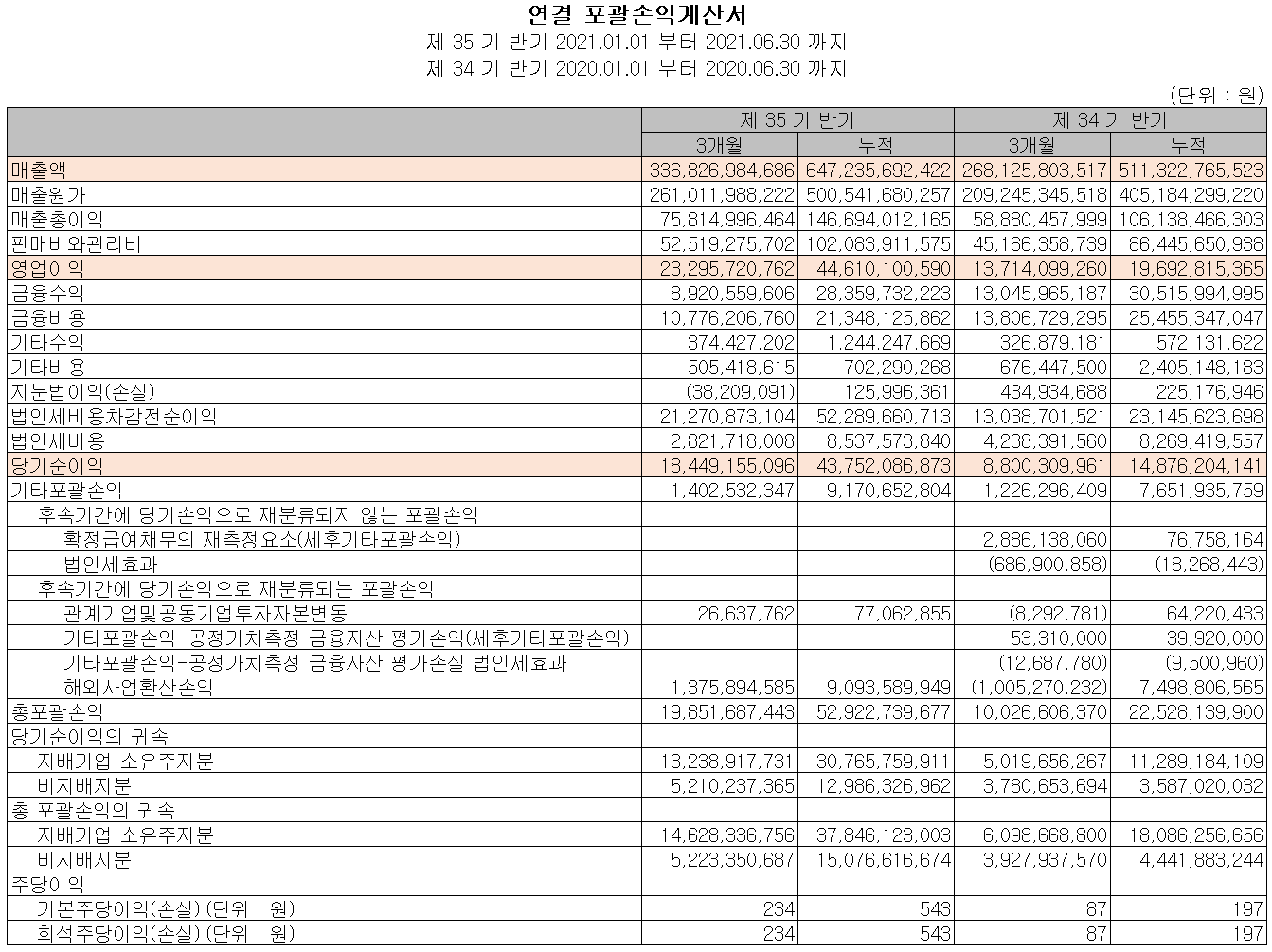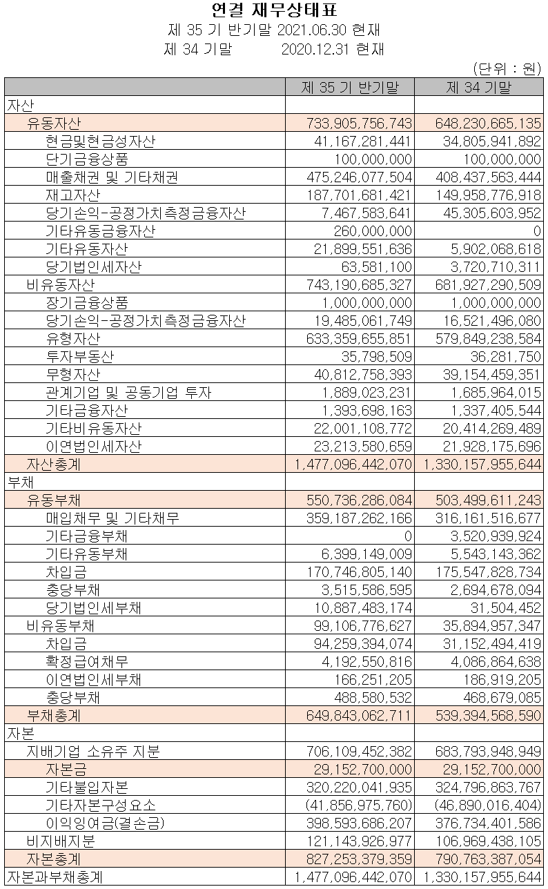 지난 상반기 말 현재 자산총계는 전기 말보다 11% 증가한 1조 4,771억 원으로 현금성 자산, 매출채권, 재고자산 및 유형자산의 증가에 기인합니다. 부채총계는 20.5% 늘어난 6,498억 원으로 매입채무 및 장기차입금의 증가에 따릅니다. 이익의 증가에 따라 자본총계는 4.6% 늘어난 8,273억 원을 기록했습니다.
