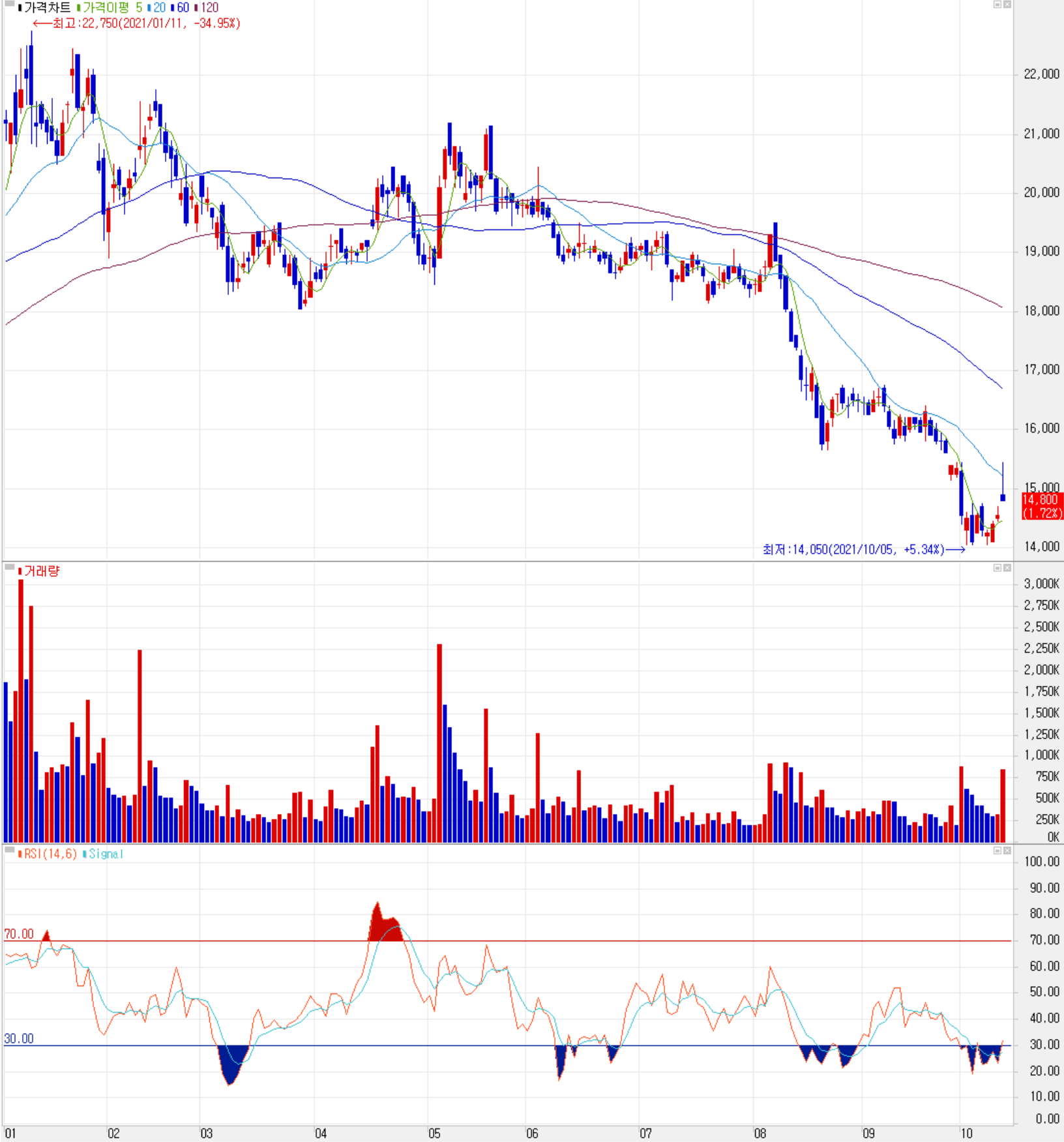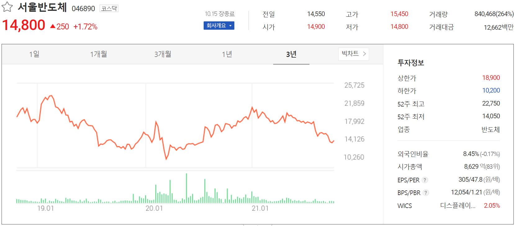 10월 15일 장 종료 기준 당사의 주가는 전 거래일보다 1.72% 오른 14,800원에 거래를 마감했습니다. 외국인 비중은 8.45%이며, 시가 총액 8,629억 원으로 코스닥 시총 기준 83위 종목입니다.