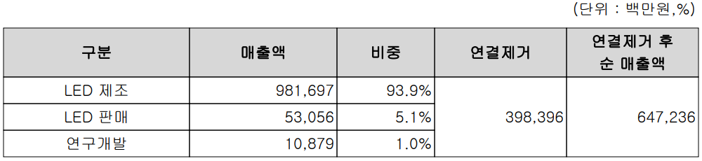 당사는 LED(Light Emitting Diode)를 제조하는 단일 사업부문으로 당사를 포함한 연결 기업인 서울바이오시스, 광명반도체, Seoul Semiconductor VINA 등에서 LED의 제조를 영위하며 중국, 일본, 독일 등 혀지 법인을 통한 상품의 판매로 구성되어 있으며, 관련 사업의 연구개발을 담당하는 2개 종속기업으로 구성되어 있습니다.