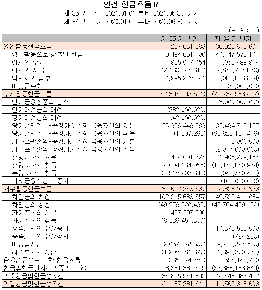 지난 상반기 영업활동 현금흐름은 173억 원의 현금이 유입되었으며, 투자활동에서는 유무형 자산의 취득(베트남 공장 추가 건설 등)으로 424억 원의 현금이 유출되었습니다. 재무활동에서는 차입금을 차입을 통한 자금을 조달하여 당기 부채를 상환하고 자기 주식을 취득하였으며, 배당금을 지급하였습니다. 2021년 상반기 말 기준 현금 및 현금성 자산은 전년 동기 말보다 296억 원이 증가한 412억 원을 보유하고 있습니다.