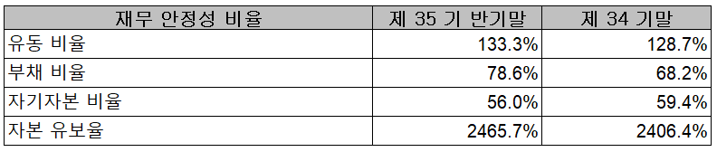 2021년 상반기 말 기준 재무안정성 비율에서는 유동비율 133.3%, 부채비율 78.6%, 자기자본비율 56%, 자본유보율 2,465.7%를 기록하면서 전반적으로 양호한 재무상태를 유지하고 있습니다.