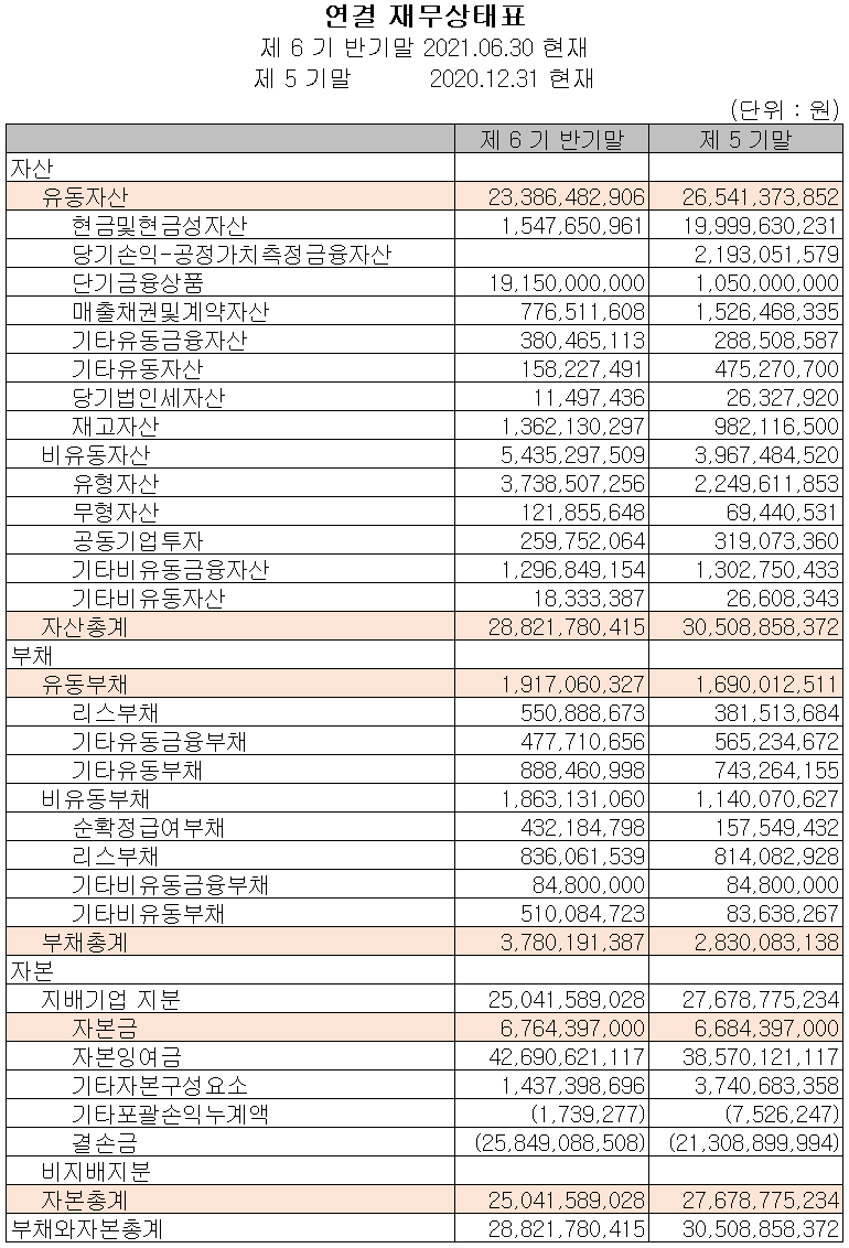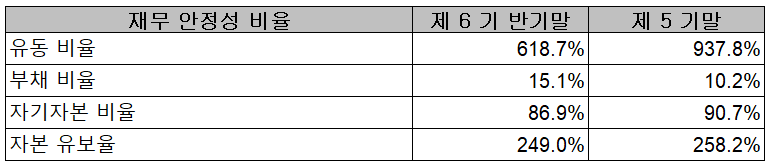 지난 상반기 말 현재 자산총계는 전기 말보다 5.5% 줄어든 288억 원이며, 부채총계는 13.4% 늘면서 38억 원을 기록했습니다. 자본에서는 당기 유상증자에 따라 자본잉여금이 41억 원 증가하였으며, 기타 자본 구성요소에서 26억 원이 감소하고, 당기 손익에 따른 결손금이 반영되면서 자본총계는 26억 원이 줄어든 250억 원을 기록했습니다.