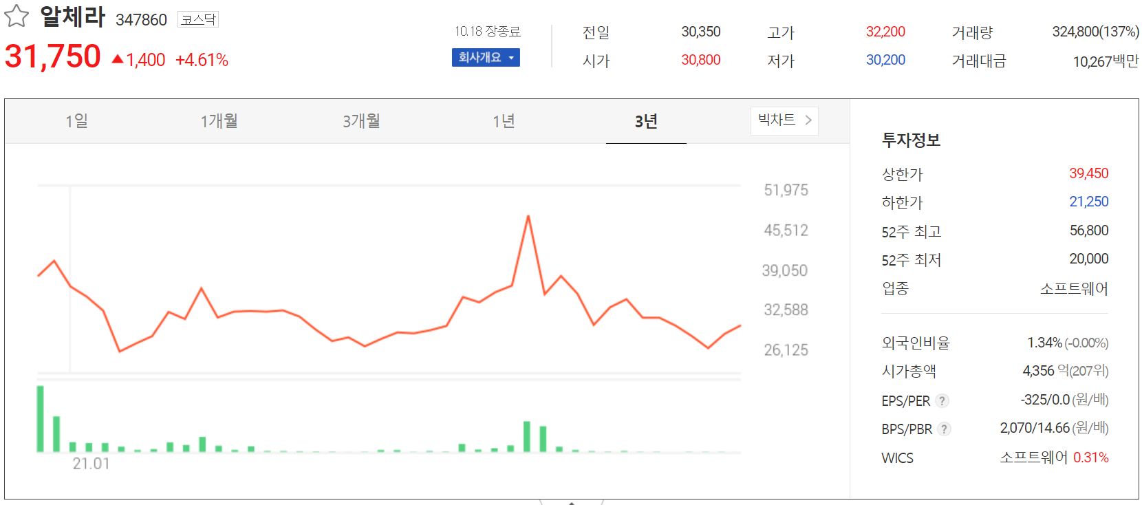 10월 18일 장 종료 기준 당사의 주가는 전 거래일보다 4.61% 오른 31,750원에 거래를 마쳤습니다. 외국인 비율은 1.34%이며, 시가 총액 4,356억 원으로 코스닥 시총 기준 207위 종목입니다.