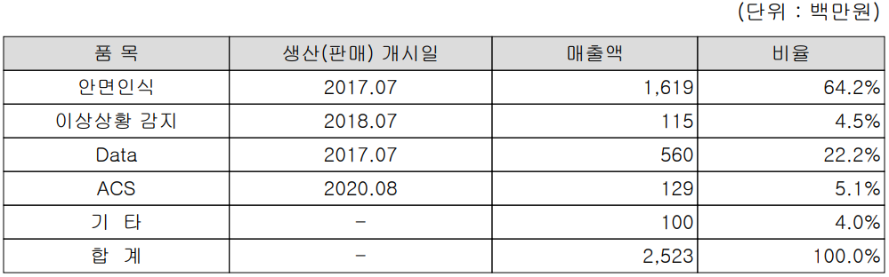당사는 인공지능 영상인식 분야에서 안면인식 AI, 이상상황 감지 AI, AI 학습 데이터 제작 및 얼굴인식 기반의 발열 감지 출입통제 시스템인 ACS 등으로 구분됩니다. 지난 상반기 안면인식 부문의 매출은 16억 원으로 전체 매출의 64.2%이며, 이상 상황 감지 솔루션은 1.2억 원으로 4.5%, AI 학습 데이터 부문의 매출은 5.6억 원으로 22.2%의 매출 비중을 기록했습니다.
