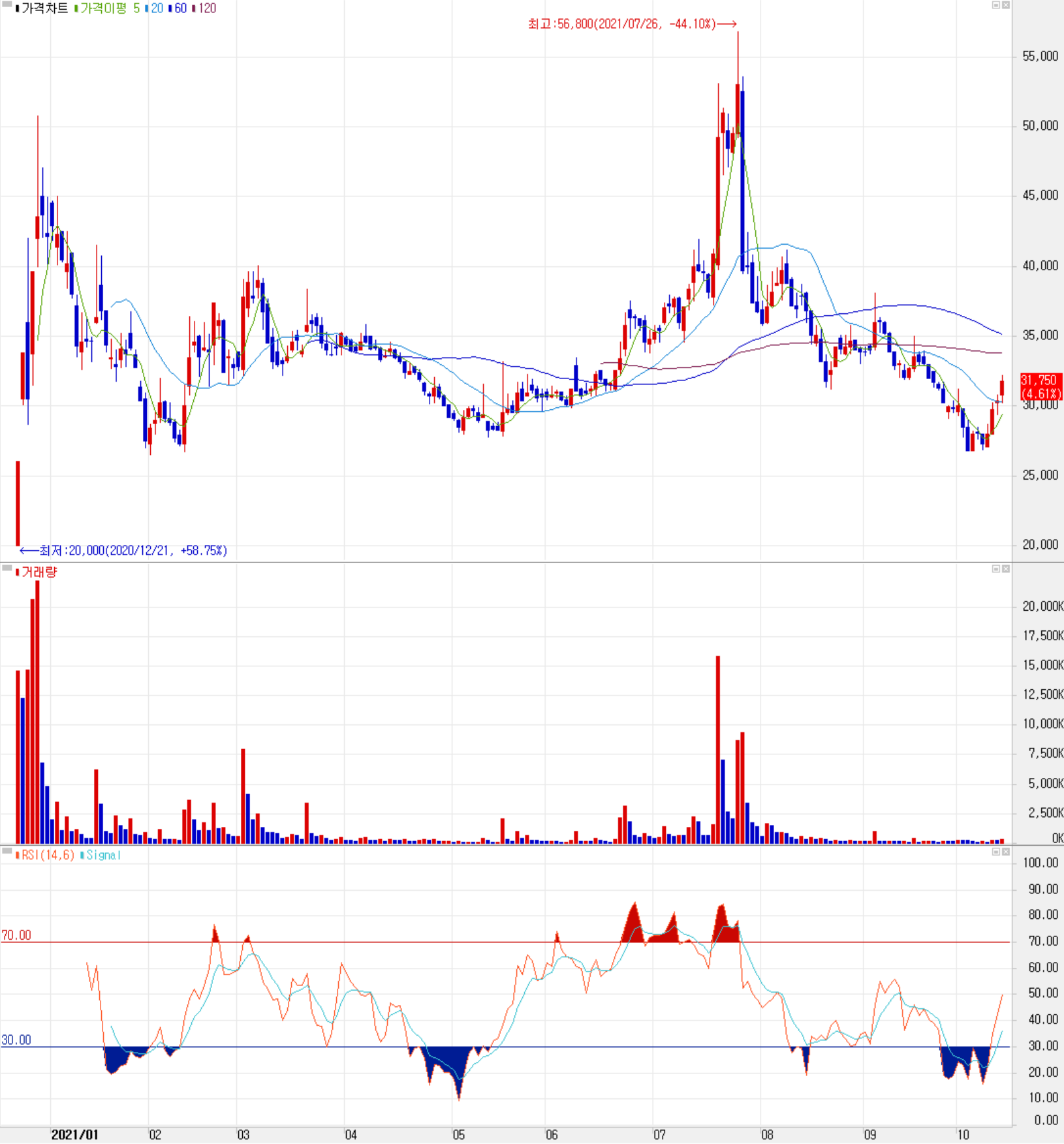 지난해 12월 21일 상장한 당사의 주가는 연초 상장 프리미엄이 걷히면서 조정을 받았고 이후 7월 들어서까지 메타버스 관련주로 주가 변동성을 보이면서 연중 최고가인 56,800원까지 올랐으나 당사가 메타버스와 직접적인 사업모델이 없다는 공고문에 따른 실망매물이 나오면서 대부분 되돌린 후 최근 3만 원 근처에서 주가가 형성되고 있습니다. 최근 한 달간 수급에서는 기관의 매도에 개인과 외국인의 매수로 대응하고 있으며, 아직도 일부 메타버스 관련주로 영향을 받는 것 같습니다. 당사는 상황인식 및 얼굴인식, 인증과 데이터 AI 분야 등 원천기술을 보유하고 있으나, 원천기술에 따른 사업 적용을 위한 연구개발비로 수익성 개선에 어려움을 겪고 있습니다. 최근 토스 등 금융기관을 고객사로 확보하면서 점차 규모 있는 매출이 일어난다면 조만간 흑자 전환을 기대할 수 있겠습니다. 차트 소견과 사업 현황을 토대로 개인적인 목표주가는 4만 원으로 설정하였으며 26,000~40,000 사이 박스 권 움직임을 염두에 두고 투자에 임할 예정입니다.