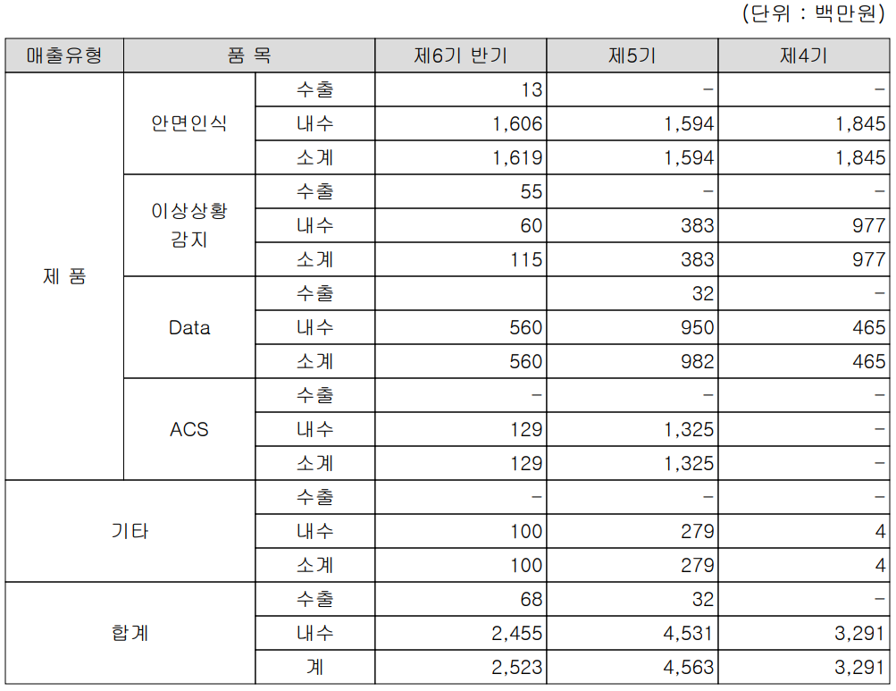 지난 상반기 실적에서 수출은 안면인식 및 이상상화 감지 부문에서 구현했으며 내수가 25억 원으로 전체 매출의 97.3%를 차지하였습니다.