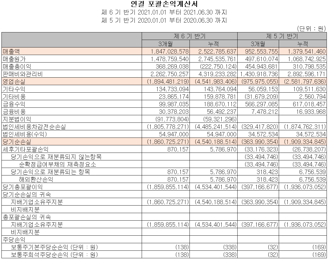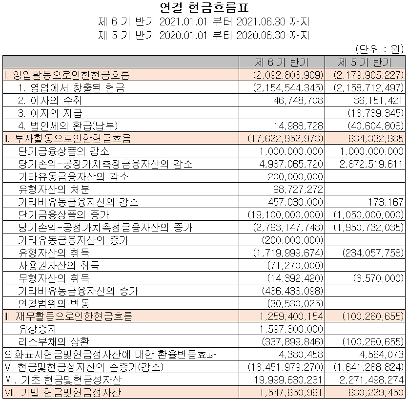 지난 상반기 영업활동 현금흐름에서는 당기손실에 따라 21억 원의 현금이 유출되었으며, 투자활동에서는 단기금융상품의 증가 및 유무형 자산의 취득 등으로 176억 원의 현금이 유출되었습니다. 재무활동에서는 유상증자를 통해 자금을 조달하였고, 당기 부채를 상환하였습니다. 2021년 상반기 말 기준 현금 및 현금성 자산은 전년 동기 말보다 9억 원이 증가한 15억 원을 보유하고 있습니다.